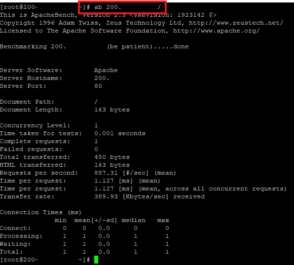 En esta prueba ejecutamos el comando # ab +IPservidor/ el cual no indicara los detalles entregados en la lista mas abajo.
